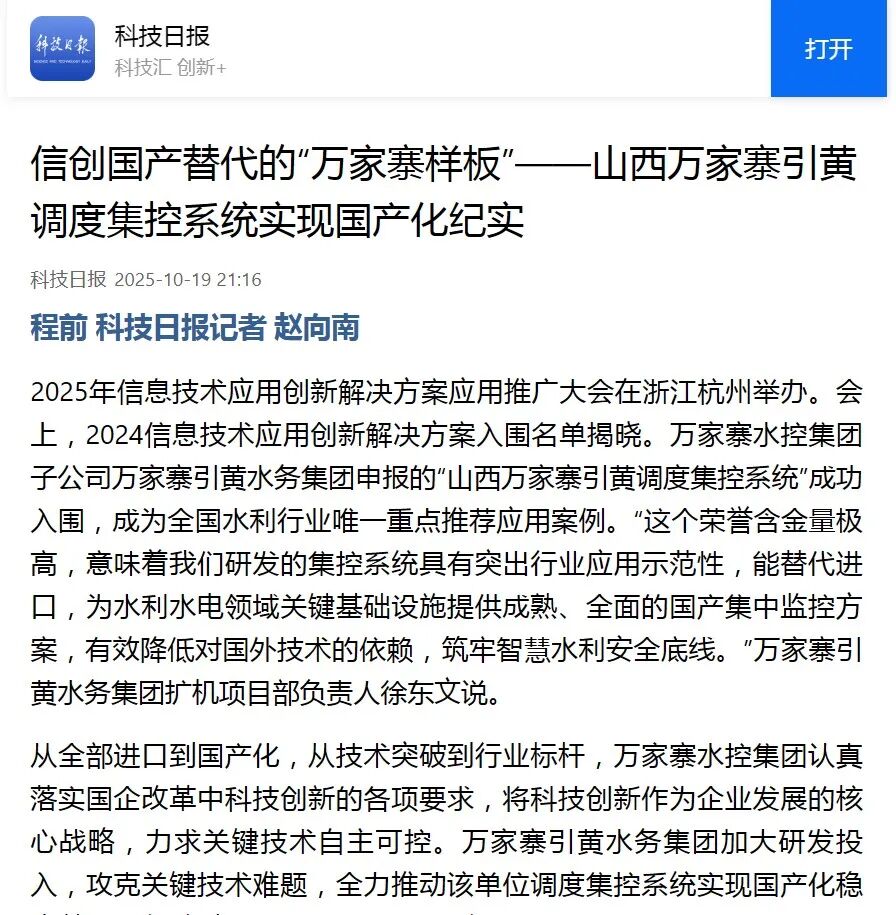 2025年信息技术应用创新解决方案应用推广大会在浙江杭州举办。会上,2024信息技术应用创新解决方案入围名单揭晓。万家寨水控集团子公司万家寨引黄水务集团申报的“山西万家寨引黄调度集控系统”成功入围,成为全国水利行业唯一重点推荐应用案例。“这个荣誉含金量极高,意味着我们研发的集控系统具有突出行业应用示范性,能替代进口,为水利水电领域关键基础设施提供成熟、全面的国产集中监控方案,有效降低对国外技术的依赖,筑牢智慧水利安全底线。”万家寨引黄水务集团扩机项目部负责人徐东文说。