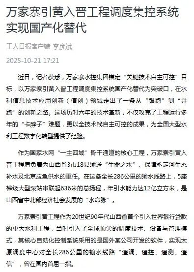 经过数年努力,2024年7月25日,万家寨引黄调度集控系统改造完工,并于同年9月15日正式投入试运行。“自主研发的这套系统解决了水利水电工程调度集控面临的信息资源整合难、系统功能协同能力不足、调度决策能力不足等多项共性的瓶颈问题,更以创新性的技术架构实现了对世界先进集控调度技术‘从跟跑到并跑’的关键突破。”研发团队负责人徐东文说,“新系统软硬件装备自主程度超过90%,实现了从硬件到应用的全技术栈自主可控。”
