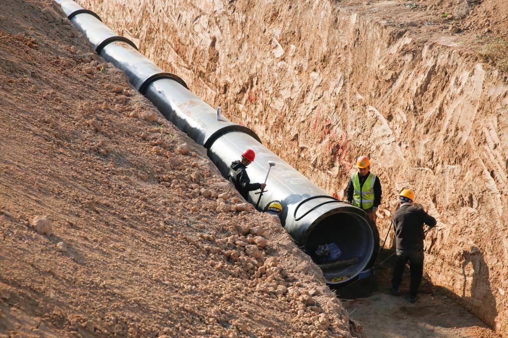 在施工12标,随着沟壑的挖掘完毕,一辆辆满载着管材的卡车缓缓驶入工地,将一根根管道小心翼翼地放入已挖好的沟槽中,随着胶圈安装、承插口处理、承插口对接胶圈处理、管道拉紧等一项项工序的进行不断刷新着工程建设“进度条”。