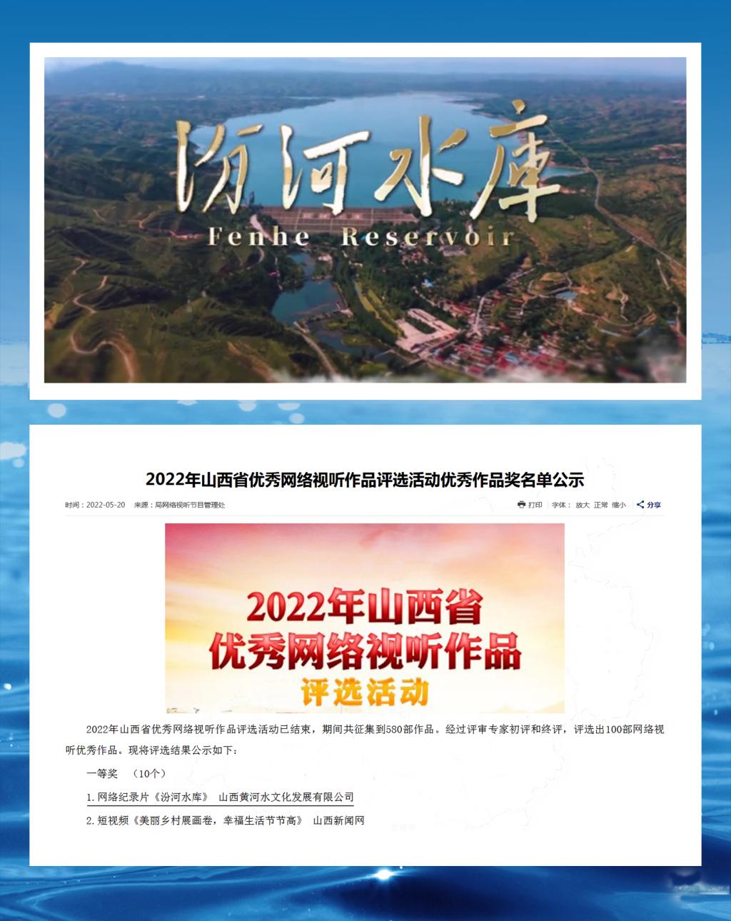 近日,由山西省广播电视局举办的“2022年山西省优秀网络视听作品评选”结果揭晓,山西黄河水文化发展有限公司历时4个月拍摄制作的《汾河水库》纪录片荣获一等奖。该片细致描绘了水库建设时期鲜为人知的细节,讲述了汾河水库修建过程和水库蓄水受益后对社会的贡献...