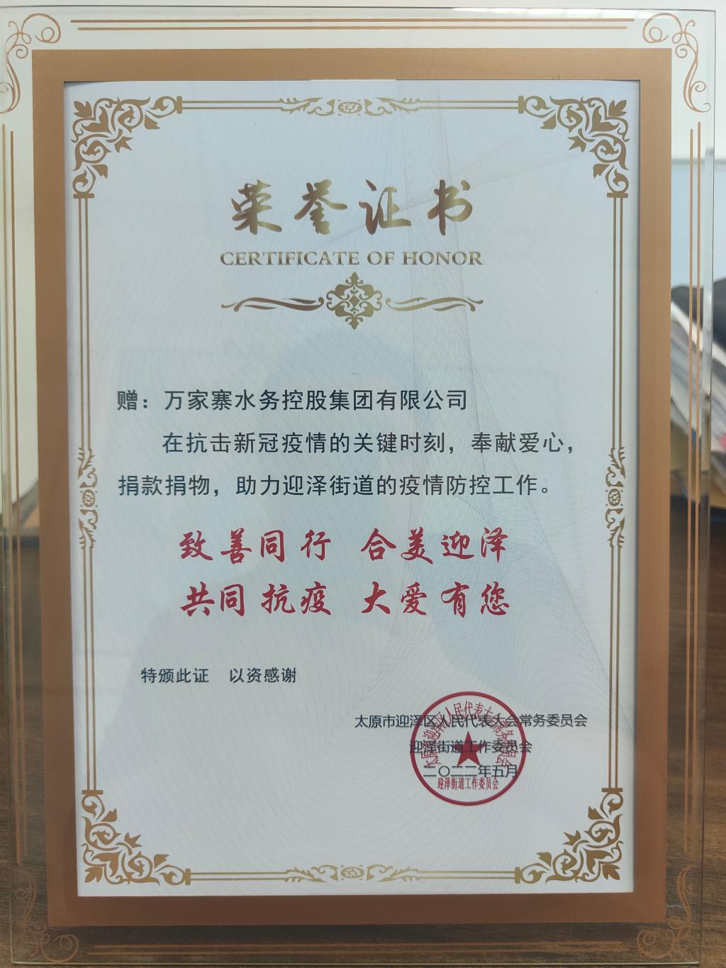集团公司获赠“共同抗疫 大爱有您”荣誉证书